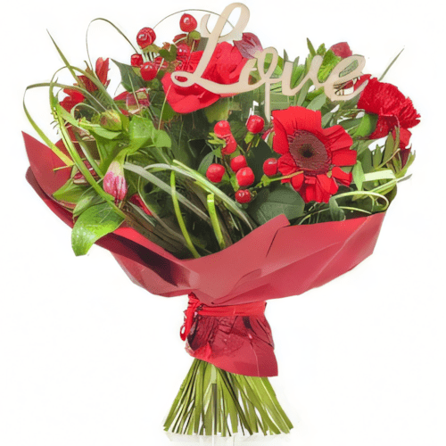 Skład: gerbera, goździk, alstromeria, pistacja, Hypericum, papier dekoracyjny, drewniany pik “Love”