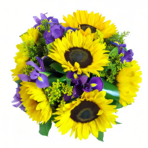 Skład: słoneczniki, irysy, rafia, zieleń dekoracyjna.