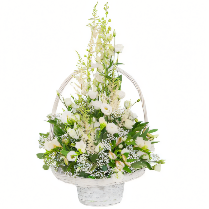 Skład: eustomy, alstromerie, tawułka, frezje, ostróżki, gipsówka, zieleń dekoracyjna, kosz